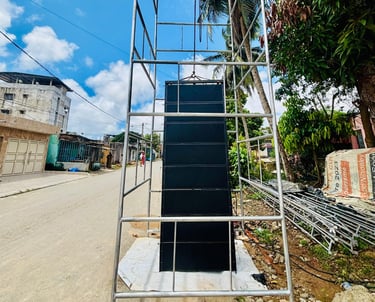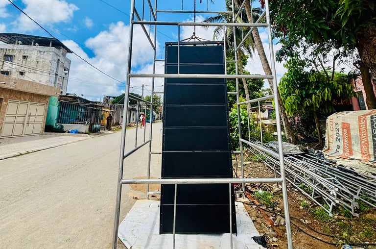 Notre équipe met en place un système audio haut de gamme, spécialement conçu pour offrir une diffusion sonore optimale en plein air. Sur cette image, vous pouvez découvrir un ensemble de line arrays (enceintes acoustiques professionnelles) parfaitement ajustées et solidement fixées sur une structure métallique sécurisée.